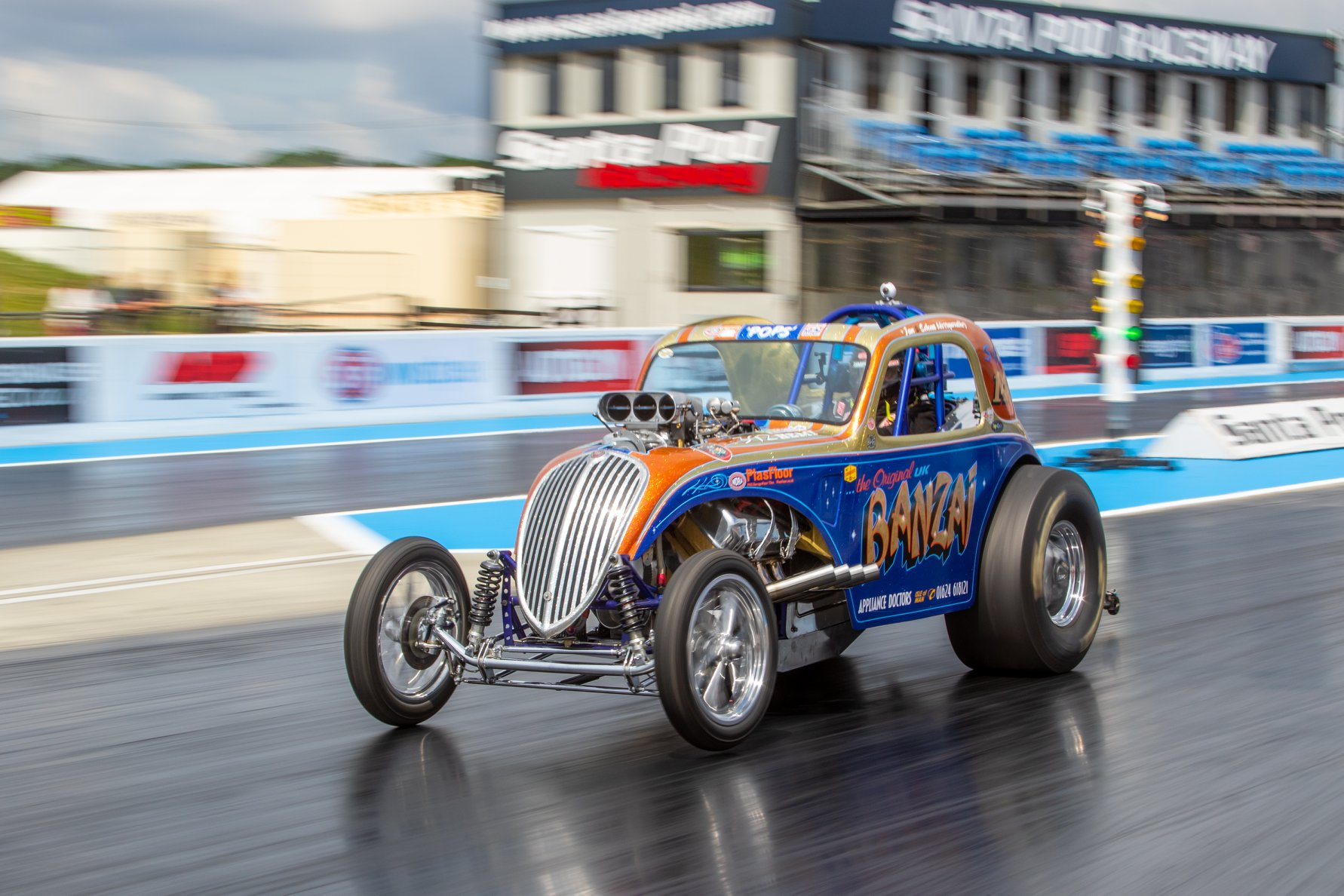 | This Fiat Topolino runs a blown and injected Chrysler 392 HEMI on methanol through an ATI Glide and Strange rear. It runs in the Supercharged Outlaws UK class. The best so far has been 7.90 @ 170 mph, although track time is limited due to the car/owner residing on the Isle of Man [home of the IOM motorcycle TT races]. No racing at all in 2020, but hoping to be out for mid 7-sec passes a plenty in 2021. |
